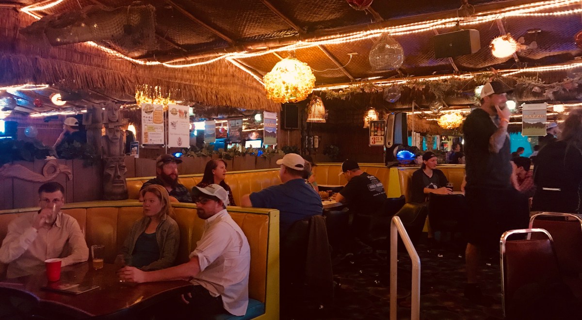 And there in no where, I mean Great Falls, lies a classic motor lodge with an kooky kitchy upstairs tiki bar. The Sip ‘n Dip Lounge. The 58,000 citizens of Great Falls don’t get gobs of tourists but between those wandering to Glacier National Park and regional conferences there are a few but the Sip ‘n Dip is well patronized by the locals so much so that on a Thursday night the placed was busy. The crowd ranges from ragged old timers to newly minted 21 year-olds. The craft beer movement long ago landed in Montana so you’ll find more beers on tap than Hawaiian shirts and tropical drinks combined. But fear not, the thatch and bamboo rages hard.